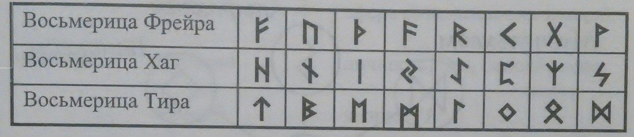 Также стоит упомянуть очень важное разделение Старшего Футарка на три восьмерицы или три Атта. Каждый Атт посвящен тому божеству, чья первая буква имени открывает Восьмерицу.