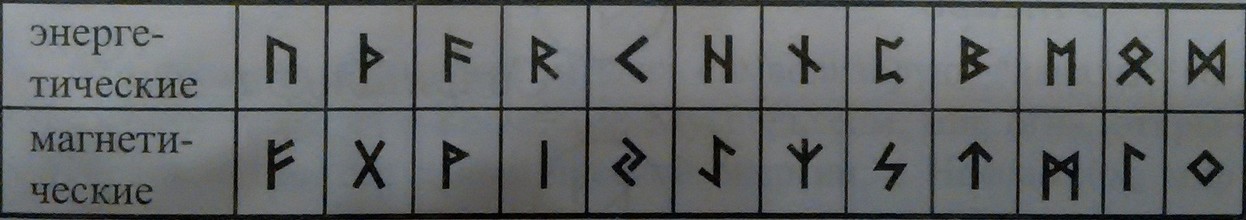 Все руны условно можно разделить на магнетические, то есть те руны, которые в процессе работы с ними потребляют на свою работу энергию. И на энергетические, такие руны, которые в процессе использования привлекают энергию извне и наделяют ею вас. В процессе рунического конструирования важно учитывать этот факт, чтобы была гармония. Излишек энергетических рун может взорвать вашу работу, а излишек магнетических создаст энергетическую воронку, которая может нанести вред вашему здоровью либо еще наломать дров. В кратковременных периодах работа таких изделий возможна, но не более. Для долговременных конструкций нужны гармоничные сочетания. Привожу разделение рун на энергетические и магнетические.